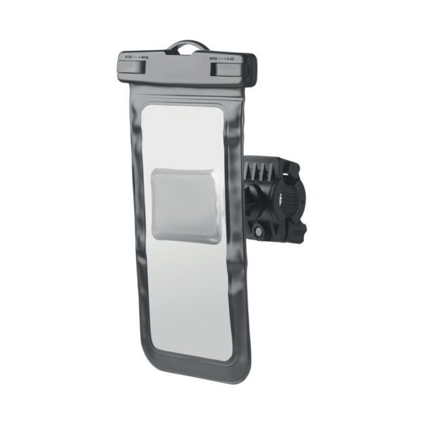 Funda de bicicleta impermeable per a mòbil, fabricada en PVC resistent i amb certificació IPX6. Ideal per mantenir el teu dispositiu protegit en condicions climàtiques adverses. El seu disseny giratori de 360 graus assegura una visualització òptima. Perfecta per a esdeveniments esportius o campanyes promocionals. Personalitzable mitjançant serigrafia amb el teu logotip corporatiu. Un regal promocional pràctic i publicitari per a empreses del sector outdoor o esdeveniments relacionats amb el ciclisme. Disponible en color negre. Regals corporatius originals i fundes de mòbil promocionals.