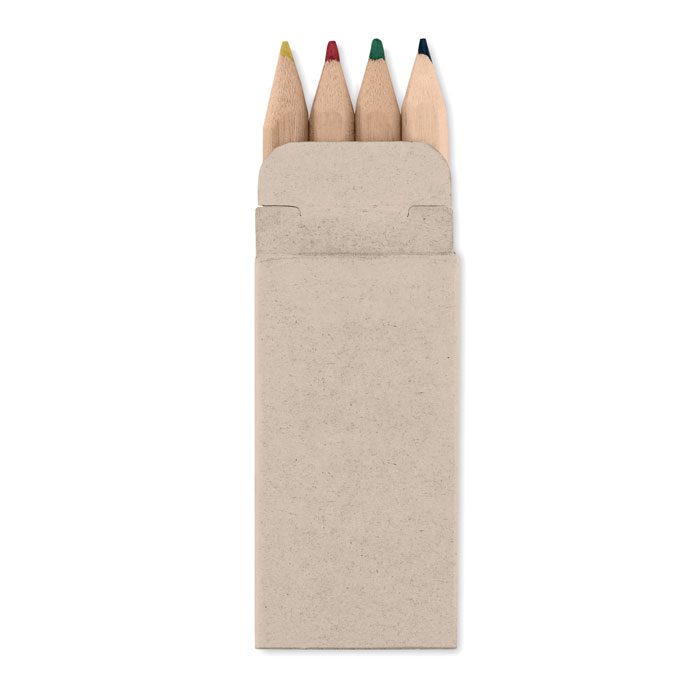 PETIT ABIGAIL, un set de minilápices corporativos perfecto para eventos y promociones. Cuatro lápices de colores en una caja de cartón reciclado, ideal para campañas sostenibles. Compacto y ligero, este artículo promocional personalizado es perfecto para ferias o como detalle de bienvenida. Fabricado en cartón kraft con un acabado natural. Personalización con el logotipo mediante serigrafía o tampografía. Regalos corporativos personalizados y artículos promocionales para empresas. Disponibles en color beige.
