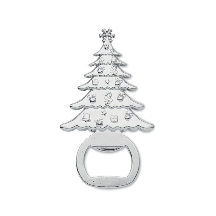 Este abrebotellas corporativo, fabricado en resistente aleación de zinc con acabado plata mate, presenta un original diseño de árbol de Navidad. Ideal como regalo promocional en eventos y campañas navideñas. Personalízalo con el logotipo de tu empresa mediante grabado láser o tampografía. Un detalle festivo y funcional para abrir botellas con estilo. Perfecto para regalos corporativos personalizados o artículos promocionales publicitarios de empresa. Longitud 11,5 cm.