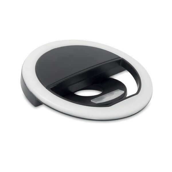 Anillo de luz LED para selfies Helie, ideal como regalo corporativo promocional. Fabricado en ABS con 8 cm de diámetro, este anillo de luz publicitaria cuenta con 28 LEDs y luz blanca ajustable en 3 niveles de brillo, perfecto para fotos personalizadas. Su batería de 80 mAh se recarga mediante cable micro-USB. Ideal para eventos, ferias y acciones promocionales. Técnica de personalización: tampografía. Color negro. Artículos promocionales para empresas y regalos corporativos.