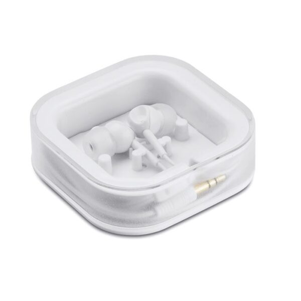 MUSISOFT son auriculares de silicona ideales como regalo corporativo. Insonorizan el ruido externo ofreciendo una mejor calidad de sonido. Con cable de 120 cm, presentados en caja de plástico. Incluyen dos pares de fundas de silicona de diferentes medidas para un ajuste perfecto. Ideales como artículos promocionales para empresas en eventos o ferias. Personalización mediante tampografía. Longitud 7 cm, anchura 7 cm y altura 1.9 cm. Color blanco. Auriculares promocionales personalizados para campañas publicitarias.