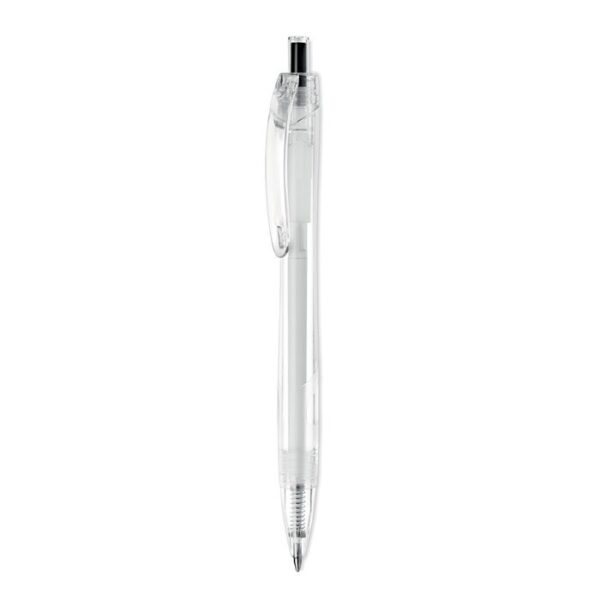 Bolígrafo RPET, un artículo promocional eco-friendly ideal para empresas. Fabricado con RPET reciclado, este bolígrafo corporativo ofrece un diseño elegante y responsable. Su mecanismo pulsador y tinta azul garantizan una escritura fluida. Disponible en negro, azul, rojo, verde, naranja y transparente, perfecto para personalizar con el logotipo de tu empresa mediante serigrafía o tampografía. Un regalo corporativo sostenible para eventos, ferias o campañas publicitarias. Longitud 14.5 cm.
