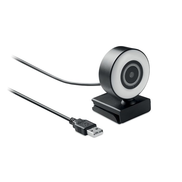 LAGANI, la cámara web corporativa que redefine tus videoconferencias. Fabricada en ABS resistente, esta cámara web promocional ofrece una resolución HD 1080P, micrófono incorporado y anillo luminoso ajustable para una imagen clara y profesional. Ideal para regalos corporativos en eventos, ferias o teletrabajo. Personalizable con tu logotipo mediante serigrafía. Disponible en color negro con acabado mate. Una solución publicitaria de alta calidad para artículos promocionales de empresa.