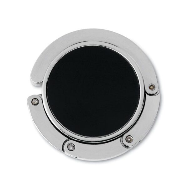El cuelga bolsos Madame es un elegante accesorio corporativo con gancho plegable segmentado para un ajuste perfecto. Fabricado en metal plateado con detalle negro, este artículo promocional es ideal para ferias y eventos. Su diseño compacto de 4.7 cm lo hace práctico y fácil de llevar. Personalízalo con tu logotipo mediante grabado láser o tampografía. Perfecto como regalo corporativo o artículo promocional para campañas de marca. Disponible en plata y negro, un detalle publicitario sofisticado y funcional.