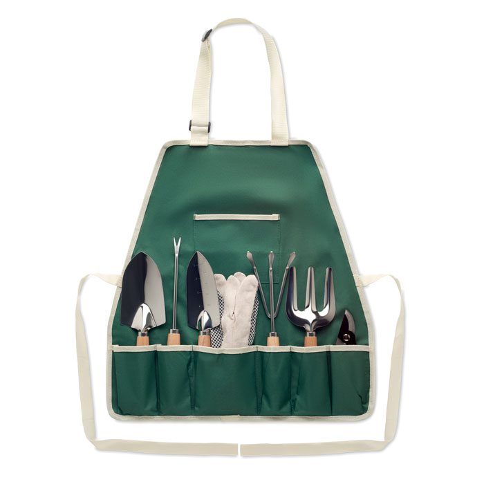 Delantal de jardín verde con siete herramientas para jardinería
