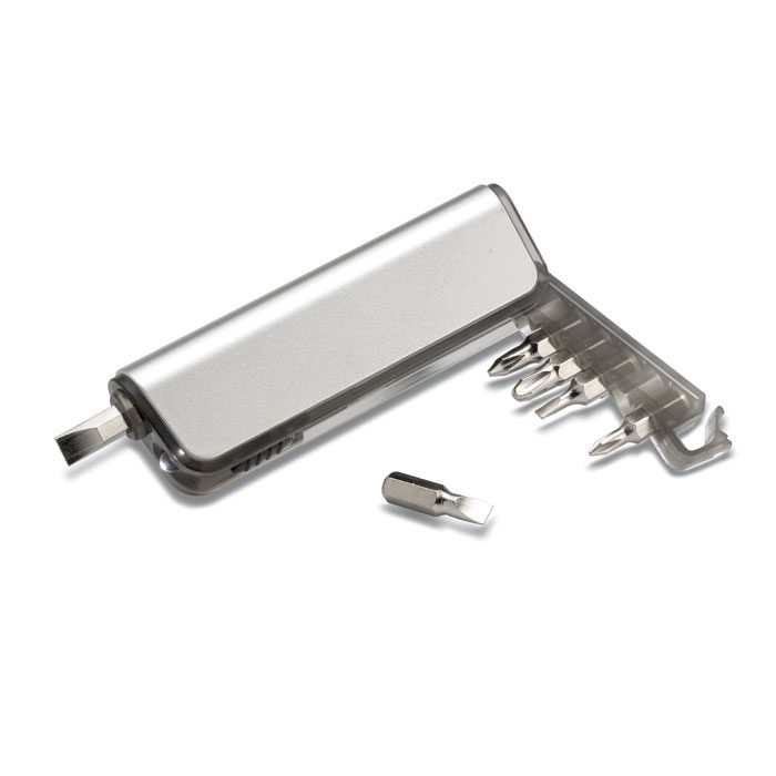 ALUTOOL, el set de destornilladores corporativo perfecto para campañas de marca. Este práctico juego promocional incluye una linterna LED, 6 cabezas intercambiables y pilas. Fabricado en ABS resistente, este set de destornilladores personalizado es ideal para eventos y regalos corporativos. Su diseño compacto y funcional lo convierte en un artículo promocional esencial para empresas. Personalización mediante serigrafía o tampografía. Disponible en gris transparente. Artículos promocionales para empresas.