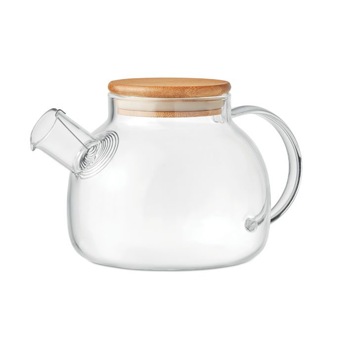 Tetera MUNNAR, una opción elegante para regalos corporativos. Fabricada en vidrio de borosilicato transparente, destaca por su infusor de acero inoxidable y tapa de bambú, ideal para eventos y campañas promocionales. Con capacidad de 850 ml, es perfecta como artículo promocional personalizado. El bambú, un producto natural, añade un toque distintivo. Personalizable mediante serigrafía. Ideal como regalo corporativo o artículo publicitario para empresas.