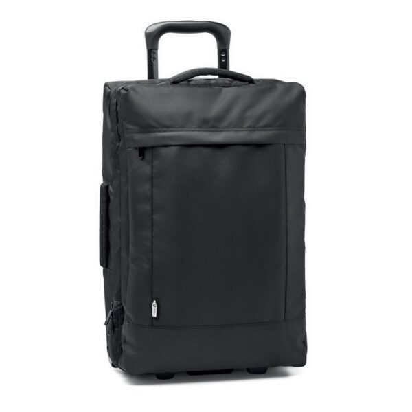 El trolley corporativo ARTIC, fabricado en RPET 600D con base rígida, es un artículo promocional ideal para eventos o viajes de empresa. Compacto y espacioso, cuenta con doble compartimento con cremallera, bolsillo frontal y asas superior, lateral e inferior. Su cierre de seguridad integrado y dos ruedas facilitan su transporte. Disponible en color negro, este trolley personalizado ofrece un acabado elegante y profesional. Técnica de marcaje: serigrafía o bordado. Ideal para regalos corporativos personalizados.